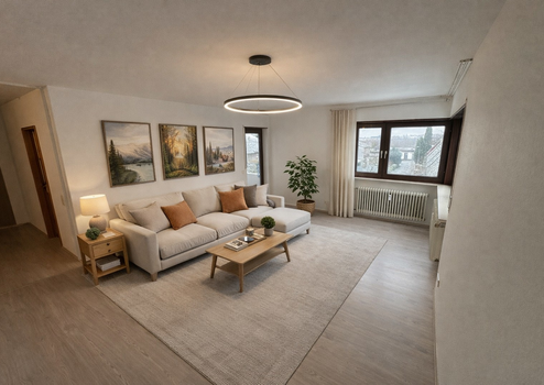 Der Flur geht in ein geräumiges und lichtdurchflutetes Wohnzimmer über, ideal zum Entspannen und Verweilen. Im Übergang vom großen Wohnzimmer gelangt man über die Esszimmernische in die separate Küche mit Fenster zum Balkon. Die Küche ist voll ausgestattet.
