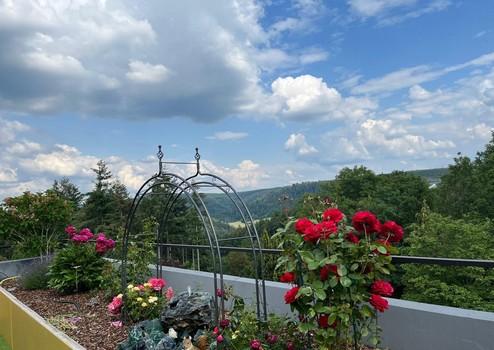 Ein absolutes Highlight ist die außergewöhnlich große Terrasse mit ca. 90 m² Fläche, die mit Wintergarten-Elementen und einem liebevoll angelegten Außenbereich ausgestattet ist. Diese großzügige Terrasse bietet viel Platz zum Entspannen, für Familienaktivitäten oder gesellige Abende im Freien.