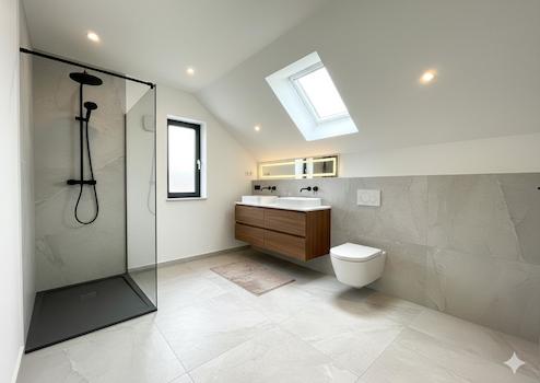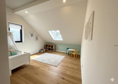 Das Obergeschoss besticht eine hochwertige Deckenverkleidung, die für ein luftiges und helles Wohnambiente sorgt.