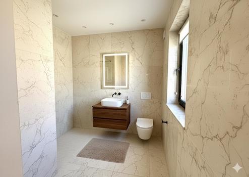 Es handelt sich hier um maßstabsgetreue Fotos, welche mit KI bearbeitet wurden. So oder ähnlich könnten die Räume nach erfolgter Renovierung und mit neuer Ausstattung aussehen.