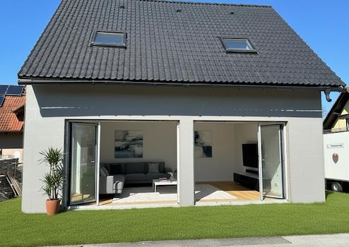 Lichtdurchflutete Räume: Große Fensterfronten und Dachfenster sorgen für natürliche Lichtverhältnisse in allen Wohnbereichen.