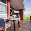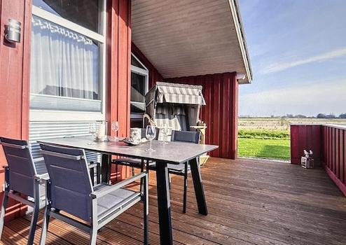 Die teilweise überdachte, und mit neuen Holzplanken belegte Terrasse ist mit einem Sitzbereich sowie einem Strandkorb bestückt.