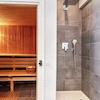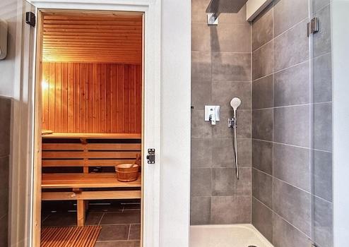 Das Bad, mit Zugang zur Sauna, ist mit Fliesen und einer Fußbodenheizung ausgestattet. Außerdem finden Sie hier einen kombinierten Waschtrockner vor.