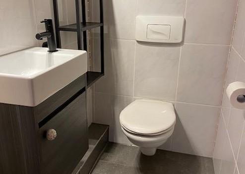 Das ebenfalls frisch renovierte WC ist separat und wurde mit Spiegel, Seifenspender, Waschtischunterschrank und Regal komplett ausgestattet.