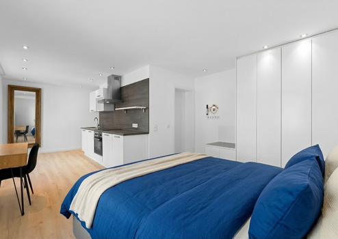 – Voll möbliert: Bett, Kleiderschrank, Sofa/Sitzecke, Tisch, Stühle, Besteck, Teller etc.