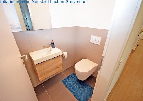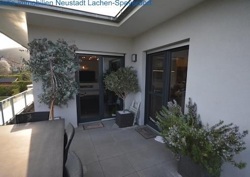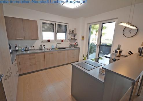 Die großen Glaselementtüren bieten von Küche und Wohnbereich aus Zugang zur traumhaften Terrasse. Ihre Grünpflanzen können hier über einen Wasseranschluss auf der Terrasse direkt versorgt werden. Der Blick in Rheinebene und aufs Hambacher Schloss ist Erholung pur für Körper und Seele.