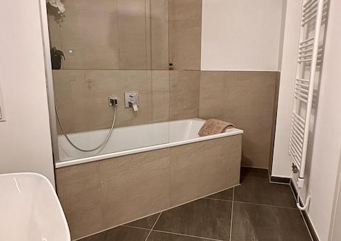 - modernes Bad mit Badewanne und Glasduschabtrennung