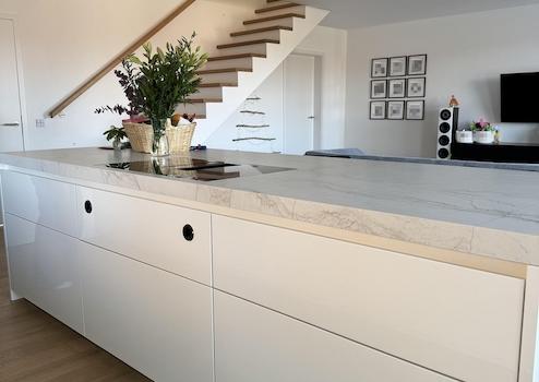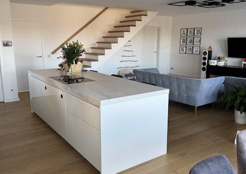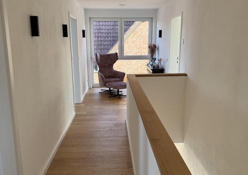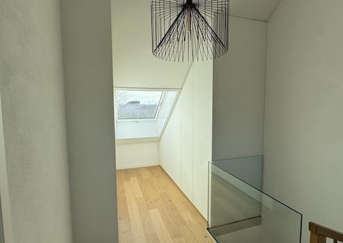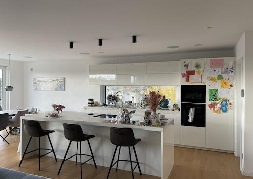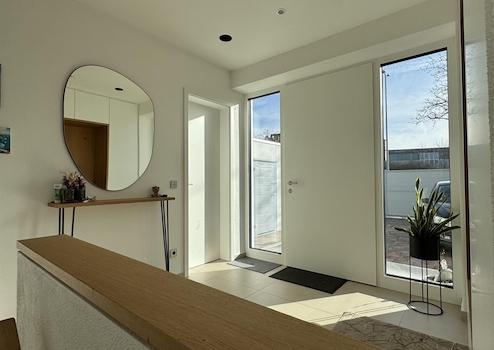 Bereits beim Betreten des Hauses fällt die stilvolle Gestaltung ins Auge: Maßgefertigte Einbauschränke im Eingangsbereich sorgen für eine klare, elegante Linie und bieten großzügigen Stauraum. Die moderne hochwertige Einbauküche mit erstklassigen Geräten wird zum Mittelpunkt des Familienlebens – funktional, offen und einladend gestaltet.