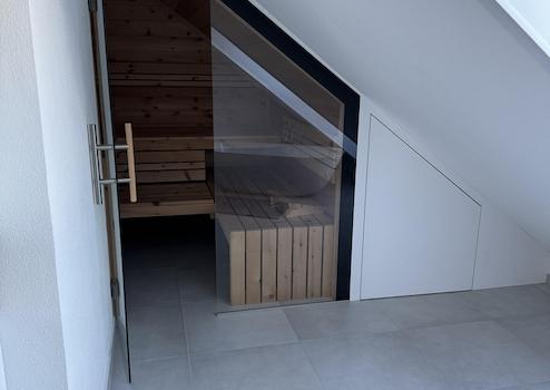 Ein besonderes Highlight ist das Hauptbadezimmer, das mit integrierter Sauna einen privaten Wellnessbereich bietet. Die durchdachte Lichtgestaltung mit hochwertiger, integrierter Beleuchtung unterstreicht die elegante Atmosphäre in jedem Raum.