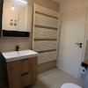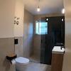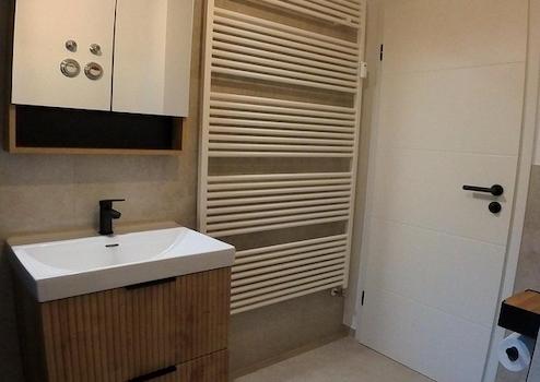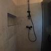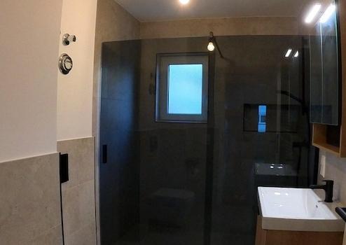 Badezimmer: Limestone Fliesen cream/matt 30x60x0,8 + Mosaikfliesen cream/matt in der barrierfreien Dusche, Fußbodenheizung