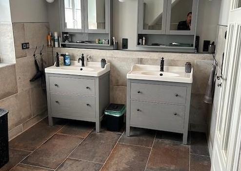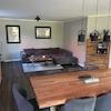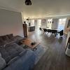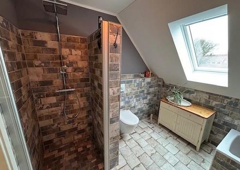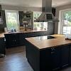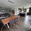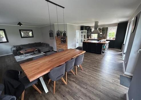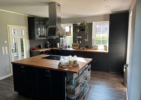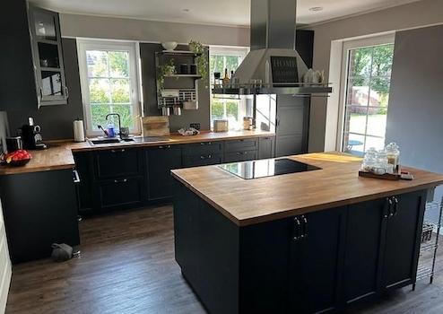 Die Einbauküche hat Kochinsel mit großem Induktionskochfeld und Dunstabzugshaube sowie einen großen Kühlschrank, einen Geschirrspüler einen Backofen und Arbeitsplatte aus massiver Eiche.