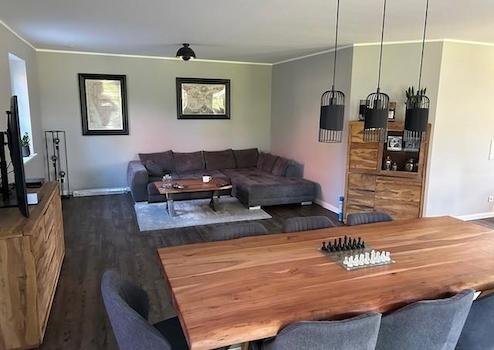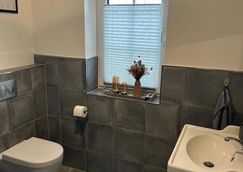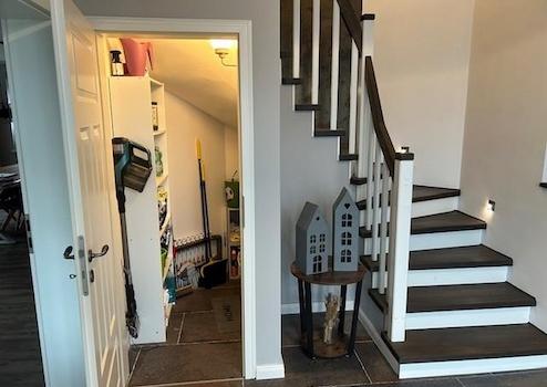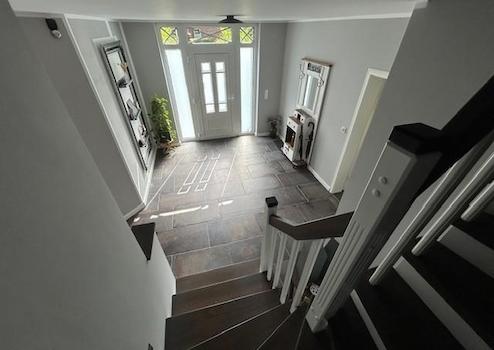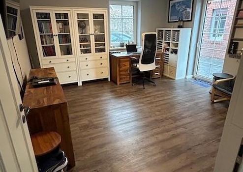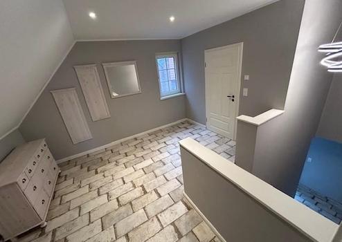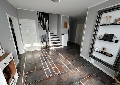 Das Haus und Garage sind komplett mit braunem Vinyl (Landhaus Eiche in Dielenoptik, Qualität - sogar für kommerzielle Nutzung geeignet) oder hochwertigen Fliesen (Bäder, Flure, HWR, Geräteraum) ausgestattet.