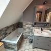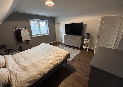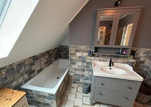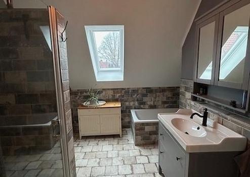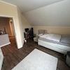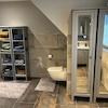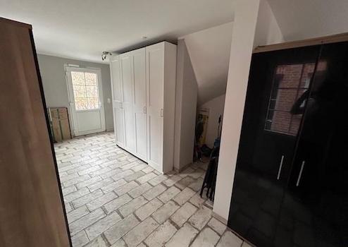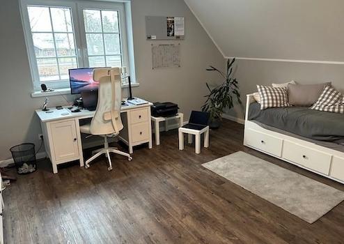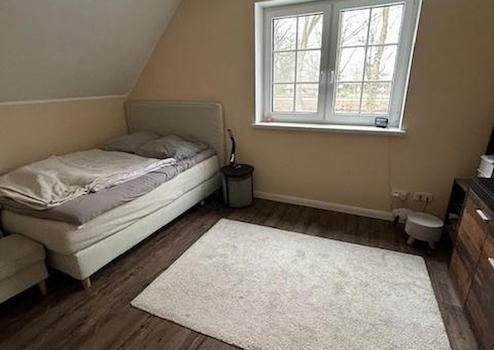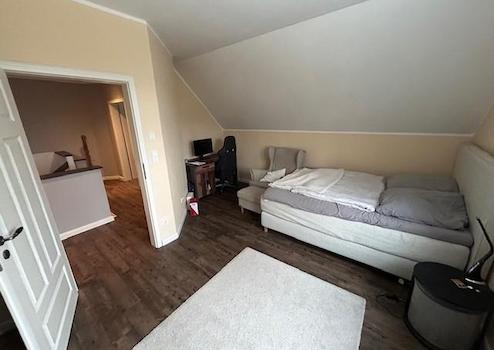Im Obergeschoss befindet sich ein Bad (14 m²) mit begehbarer Dusche, 2 Kinderzimmer (15m² und 20 m²) ein Abstellraum (ca. 7²) sowie das Schlafzimmer (ca. 20 m²) mit Zugang zum Ankleideraum (ca.15m²). Zusätzlich besitzt das Haupthaus einen sehr großen Dachboden der bislang nicht ausgebaut ist (aber komplett gedämmt ist).