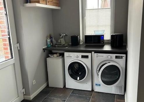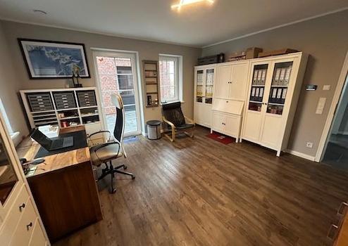 Das Haus selbst verfügt im Erdgeschoss über eine große Wohnküche (56 m²) inkl. Einbauküche, einen großen Eingangsflur, Gästebad mit Dusche sowie einen weiteren Raum (20 m²) der aktuell als Büro genutzt wird. Das Haus kann des Weiteren über den Nebeneingang in den Hauswirtschaftsraum (inkl. RFID Kartenzugang) betreten werden.