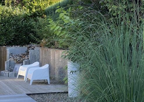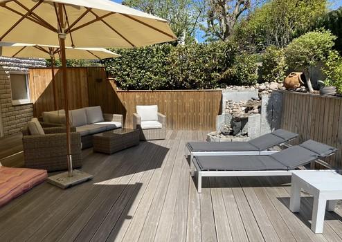 Aussenbereich: Bankiraiholzterrassen, große geflieste Garage, 3fach Carport, Geräteschuppen, elektrisches Hoftor