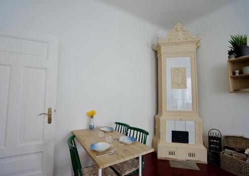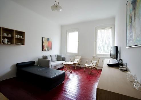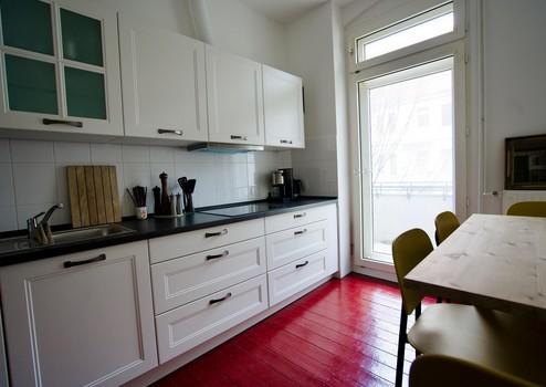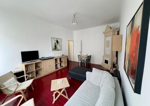 Freuen Sie sich auf einen originalen Holzofen und die originalen Bodendielen in Altberliner Ochsenblutfarbe.
