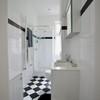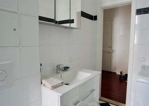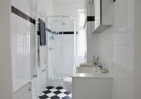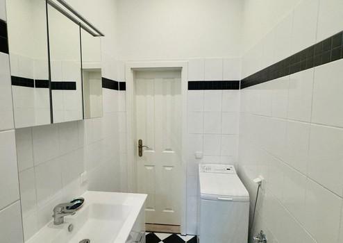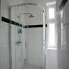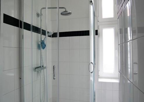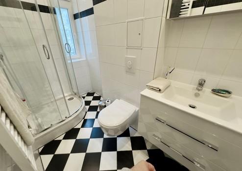 Das neue Badezimmer mit zeitgemäßer Ausstattung und einer einladenden Dusche wurde auch hell gestaltet mit Außenfenster.