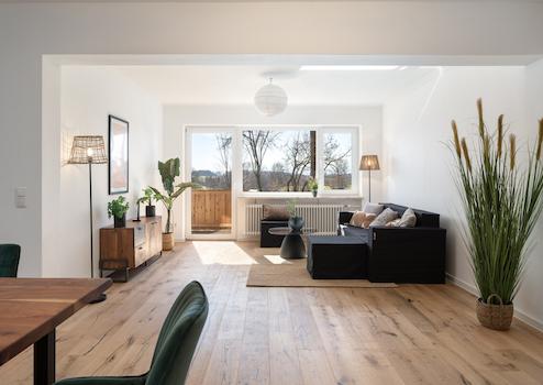 Ein lichtdurchfluteter Wohn und Essbereich mit über 40 m² und großen Fensterflächen öffnet den Blick auf die umliegende Natur und die Berge. Der Wohnbereich mit direktem Zugang zum Balkon bietet Sonne und Aussicht – und führt über eine kleine Treppe direkt zu den beiden Stellplätzen vor dem Haus. Hier findet sich außerdem eine ca. 20m² große Fläche, die als kleiner Garten oder Terrasse genutzt werden kann.