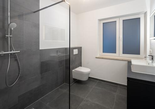 -Neues, modernes Badezimmer mit bodengleicher Dusche, großformatigen Fliesen und Fenster