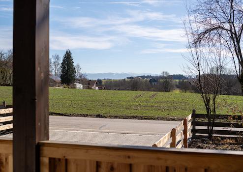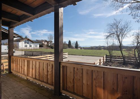 Zugleich beginnt direkt vor der Haustür die Natur: zahlreiche Spazier und Radwege führen durch Wiesen und Felder bis hin zu den nahen Wäldern und zum Golfplatz Pfaffing. Das Alpenpanorama gehört hier zum Alltag – an klaren Tagen reicht der Blick bis zur Kampenwand.