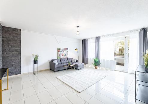 Das Wohnzimmer, die Küche sowie das Kinderzimmer verfügen jeweils über eine komplette Wand mit bodentiefen Fenstern. Diese sorgen nicht nur für hervorragende Lichtverhältnisse, sondern ermöglichen auch direkten Zugang zum großen, überdachten Balkon.