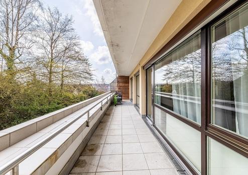 Der Balkon ist seitlich am Haus gelegen, angenehm ruhig und bietet einen Blick ins Grüne – ideal für entspannte Stunden im Freien mit hoher Privatsphäre.