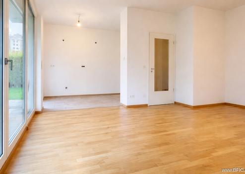 Der Wohn- und Essbereich bildet das Zentrum der Wohnung. Großzügige Glasflächen öffnen den Raum zur rund 10 m² großen Terrasse und dem etwa 50 m² großen, sonnigen Garten. Hier lässt sich die Ruhe des Innenhofs genießen, während man gleichzeitig nur wenige Schritte vom städtischen Leben entfernt ist. Die Süd-Ausrichtung sorgt ganztägig für Licht und Wärme, die gepflegte Bepflanzung schafft eine natürliche Begrenzung.