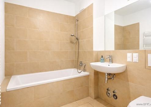 Das Badezimmer ist modern ausgestattet, mit Badewanne, Waschbecken und WC. Großformatige, helle Fliesen, klare Linien und hochwertige Armaturen verleihen dem Raum eine ruhige, gepflegte Anmutung. Zusammen mit den hohen Decken entsteht ein harmonisches, modernes Raumgefühl, das den Anspruch der gesamten Wohnung unterstreicht.