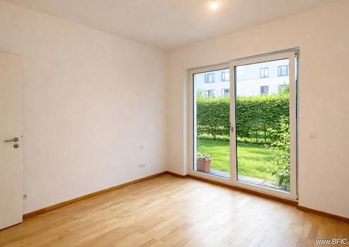 Rechts liegt das quadratische Schlafzimmer, ruhig zum Garten hin ausgerichtet. Bodentiefe Fenster sorgen für Helligkeit und ermöglichen den direkten Zugang zur Terrasse und zum privaten Garten. Von hier aus blickt man ins Grüne, ohne Einblick von außen – ein seltenes Stück Privatsphäre mitten in der Stadt.