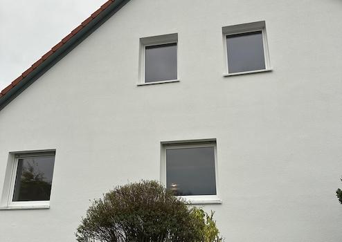 -Kompletter Austausch der Fenster und Einbau von weißen Kunststofffenstern (Fa. Denzlein) mit Zweifachverglasung.