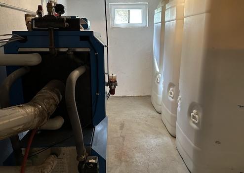 -Einbau eines Buderus Öl-Niedertemperaturkessels mit Kunststofftank (3000l) mit kompletter Verteilungstechnik, Rohrleitungen und Flächenheizkörpern im Haus.
