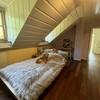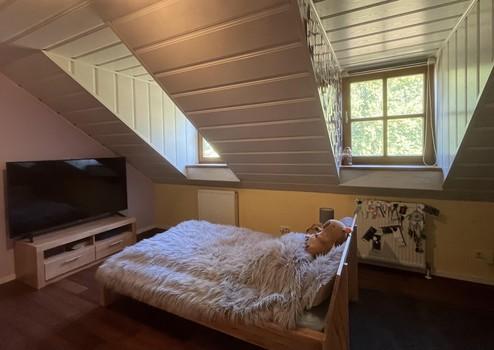 Im Obergeschoss befinden sich drei gemütliche Schlafzimmer und ein stilvolles Badezimmer. Zwei weitere Zimmer liegen im Untergeschoss, das durch seine Hanglage direkten Zugang zum Garten bietet – ideal als Gäste-, Hobby- oder Arbeitszimmer. Hier finden Sie auch die Sauna für entspannte Stunden sowie einen praktischen Hauswirtschaftsraum.