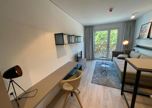 Es ist sehr modern ausgestattet mit Fußbodenheizung und separater Schreibecke sowie Geschirrspüler und Flachbild-TV. Die Küche ist mit einer Grundausstattung an Geschirr und Besteck ausgestattet. Außerdem werden im Haus viele Annehmlichkeiten wie Dachterrasse, Leseecken, Fitnessstudio, Rezeptionsservice u.v.m. geboten.
