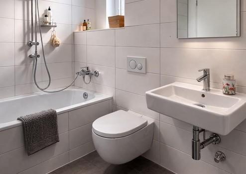 Das Badezimmer entspricht modernem Standard und verfügt über ein Fenster, eine Badewanne mit Regendusche sowie eine Waschmaschine.
