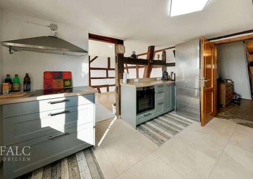- offener Koch- und Ess- oder Wohnbereich mit freiliegender Holzfachwerkwand
