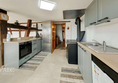 Im Erdgeschoss erwartet Sie ein offener Koch- und Ess- oder Wohnbereich mit einer freiliegenden wunderschönen Holzfachwerkwand. Der Kochbereich ist mit einer neuen Einbauküche und einem geschmackvollen Holzbeistellherd mit Backofen ausgestattet.