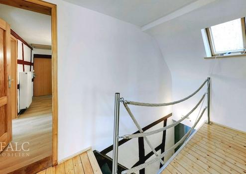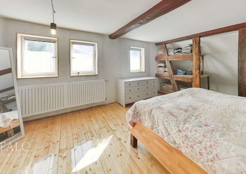 Im Dachgeschoss befindet sich ein großes Schlafzimmer mit teilweise offenen Fachwerkwänden, was für eine behagliche Atmosphäre sorgt. Auch das angrenzende Kinderzimmer punktet mit sichtbarem Gebälk. Ein Duschbad, sowie ein separates WC, ein Heizraum und ein Abstellraum stehen ebenfalls zur Verfügung. Vom Dachgeschoss aus haben Sie Zugang zum Raum über der Tenne. Dieser Teil des Hauses beeindruckt mit seiner hohen Decke und kann zu einem großzügigen und schönen Zimmer ausgebaut werden. Zudem steht noch ein großer, gedämmter Spitzboden für weitere Ausbaureserve oder Lagerfläche zur Verfügung. Ihre Wohnträume finden hier ein Zuhause!