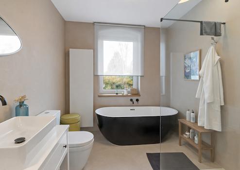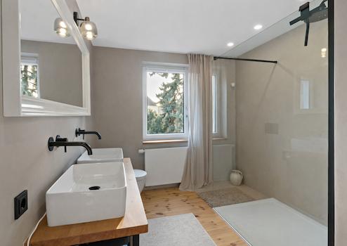 Ergänzt wird diese Ebene durch eines der insgesamt vier möglichen Schlafzimmer sowie ein stilvoll ausgestattetes Badezimmer mit Badewanne und großzügiger, ebenerdiger Walk-In-Dusche.