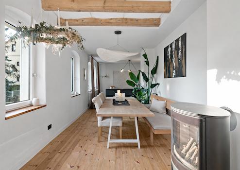 • offener Wohn- und Essbereich mit Kamin und moderner Kücheninsel