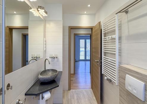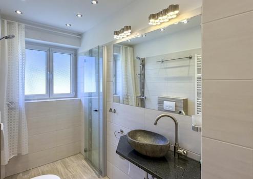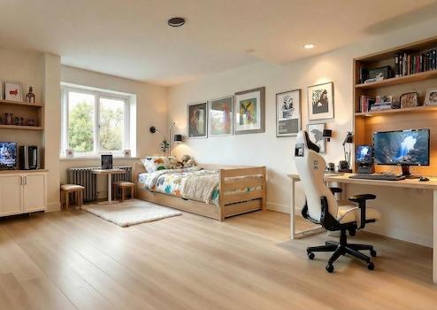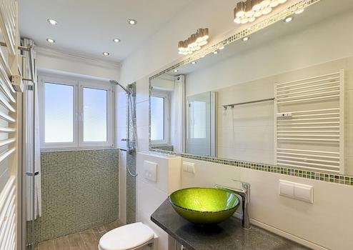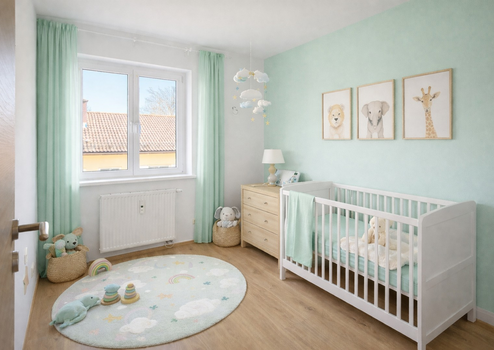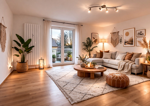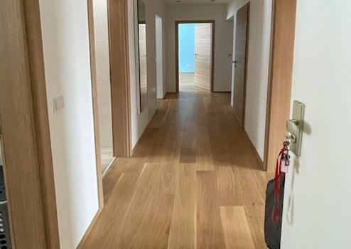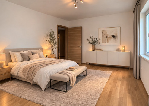 Die Wohnung ist mit Fliesen und Parkett ausgelegt. Die beiden Tageslichtbäder wurden aufwändig renoviert. Die Einrichtungen von Schlafzimmer, Wohnzimmer, Zimmer 1 und Zimmer 2 wurden als Vorschläge mit KI generiert. Es wurden auch neue Heizkörper, Zimmertüren und die Wohnungseingangstüre eingebaut. Wände und Decken wurden aktuell weiss gestrichen. Der Elektroverteiler in der Wohnung wurde mit FI erneuert.
