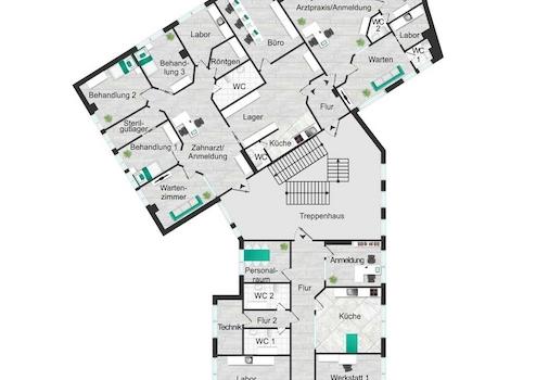 - einem Geschäftshaus mit 11 Gewerbeeinheiten auf 1.200 m² Fläche, Baujahr 1993, welches Ärzte, Apotheke, zahntechnisches Labor, Gastronomie, Fitnessstudio, Gesundheit/Pflege und Büros beherbergt mit großem angrenzendem Mietparkplatz