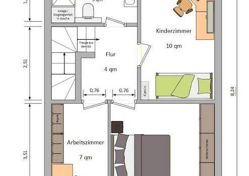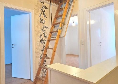 Der Wohnbereich erstreckt sich über zwei Stockwerke (EG + OG) zu je 43 qm Grundfläche. Hinzu kommt ein Keller mit drei Räumen, der sich ebenfalls über diese Grundfläche ausdehnt. Das nicht ausgebaute Dachgeschoss bietet weiteren, großzügigen Stauraum.