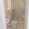 Dusche mit Glasabtrennung.