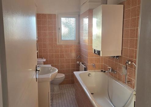 Großes Badezimmer, mit Badewanne im 50ziger Jahre Stil.