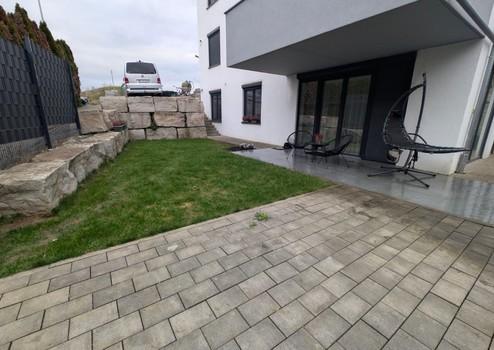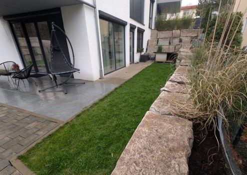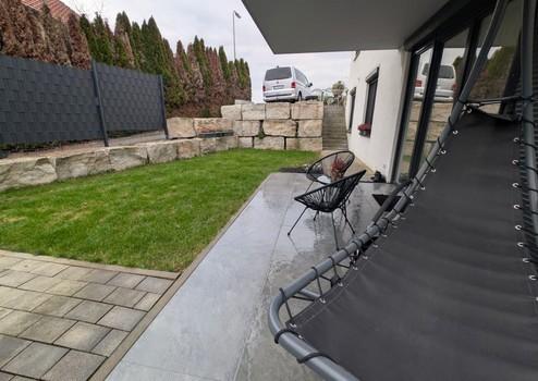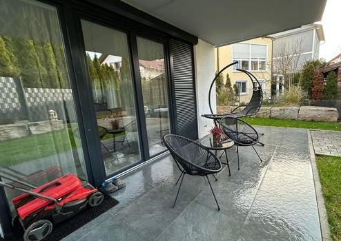 Eigene Terrasse und großer Garten mit separatem Eingang bieten privaten Freiraum im Freien.