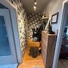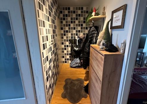 Flur mit Einbauschrank. Schlafzimmer mit Schrank. Voll ausgestattete Küche. Wohnzimmer mit TV-Gerät und Sofa.