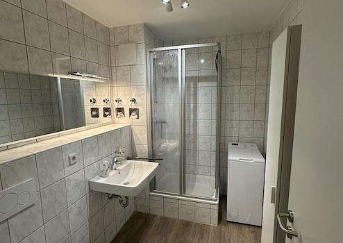 Badezimmer: Modernes Bad mit Dusche, Waschbecken, WC, Waschmaschine und Föhn