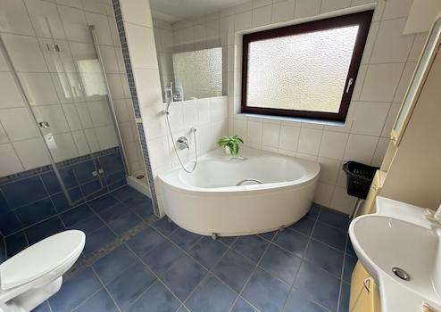 - modernes Bad mit Eckbadewanne, separater Dusche, WC und Waschbecken