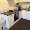 Die Wohnung verfügt über eine Einbauküche mit Herd, Backofen und Kühlschrank.