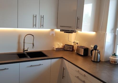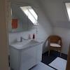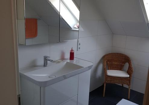 Das moderne Bad im Erdgeschoss ist mit einer bodentiefen Dusche (1,00 m x 1,00 m), WC und Bidet ausgestattet. Außer dem Wandheizkörper (Handtuchwärmer) sorgt eine Fußbodenheizung für angenehme Wärme. Die Anschlüsse für eine mögliche Badewanne wurden 2017 hinter einer Fliese verlegt, sodass bei Bedarf eine Eckbadewanne problemlos eingebaut werden kann.
